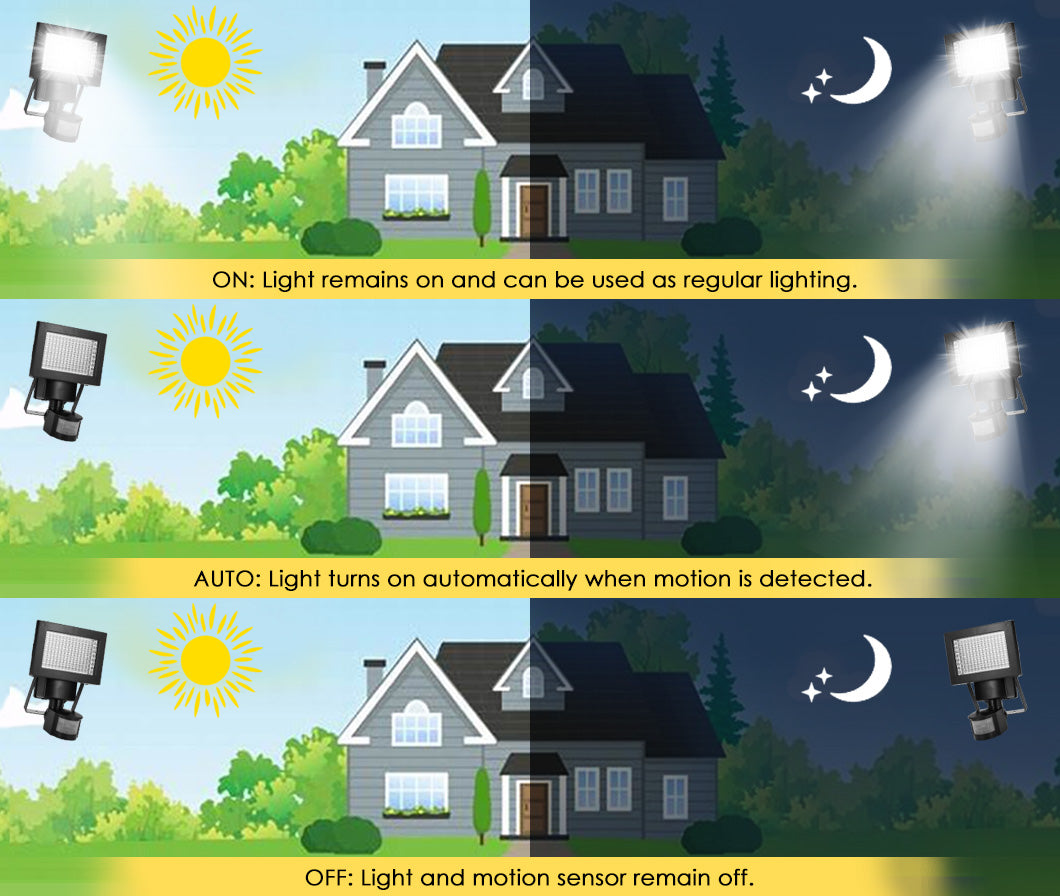Three Operation Modes: For security purposes it has three modes of operation--- Auto/ON/OFF--- for flexible use.
