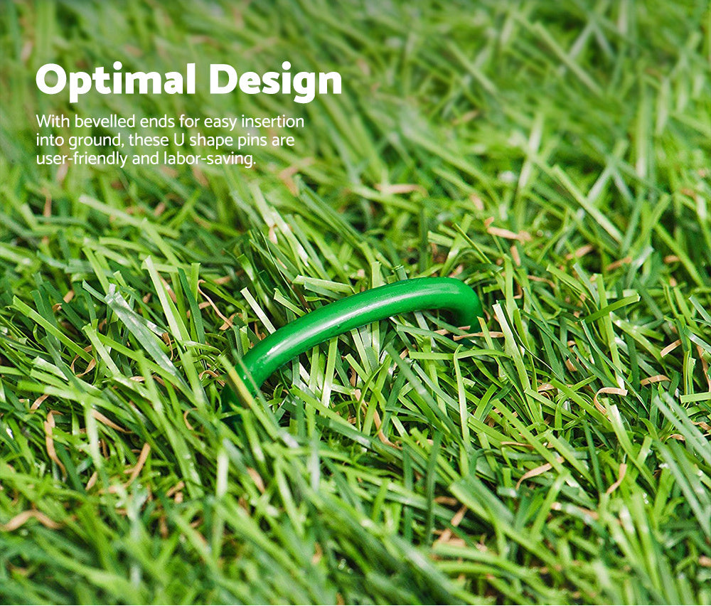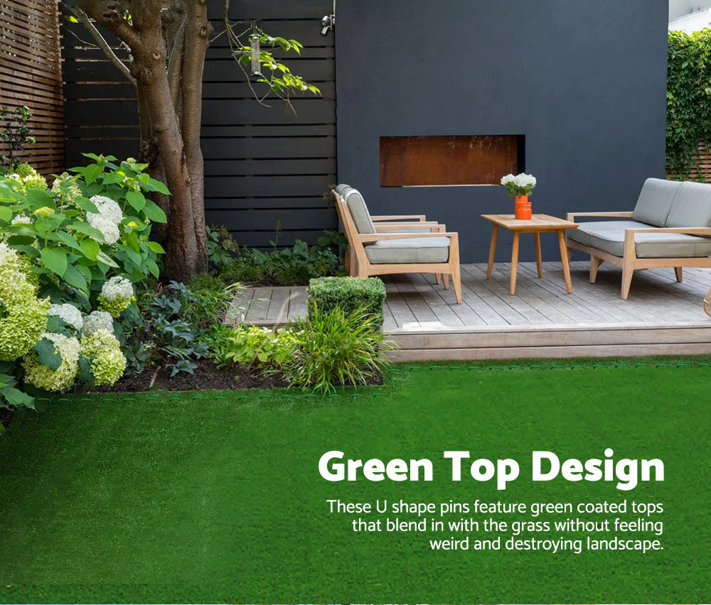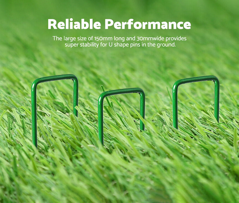 Caring for your lawn is expensive and time-consuming. Not only do you have to worry about mowing your grass but you also have to fertilize plant new grass seeds and rake leaves. Artificial grass is somewhat of a shortcut to a nice lawn in which case high-quality U shape pins are necessary for securing the artificial grass. Made of 3mm diameter galvanized steel wire these U shape pins do not bend easily and are corrosion resistant for long lasting life in tough Australian conditions. They feature bevelled ends for easy insertion into ground. Simply knock them in using a mallet or hammer and the job is done. These synthetic grass pegs are super stable in the ground so they do not get pulled up easily for your peace of mind and the green painted tops help them blend in with the grass. Ideal for securing ground sheets netting garden pipes landscape fabric cables artificial grass these U shape pins are really something you won’t regret.