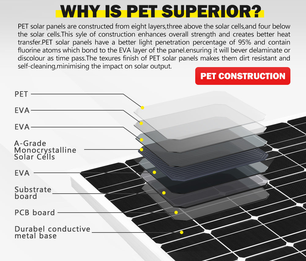 If you have been searching for a reliable source of power to charge your electronic devices RV watering system caravan and camper trailer etc. this 10W 60W 130W 200W 250W solar panel is the perfect investment for you. This eco-friendly solution is heavy-duty constructed which is ideal for people who like to spend most of their time at home or RV. A-grade Monocrystalline whose energy conversion is 21.5% more efficient than previous generation is born to provide rapid and reliable source of power when your electronic devices are running out of it. And this fixed module is equipped with premium PET films which features superior light penetration rate and guarantees reliable power supply in low light conditions. Tempered glass enables it to resist impact shock vibration and even hail.