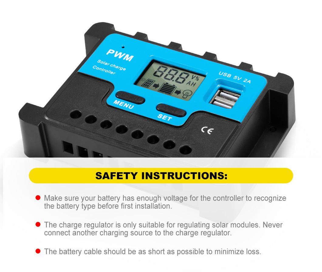 Programmable Voltage: The voltage of this PWM solar controller is programmable to ensure the safety and longevity of different batteries.