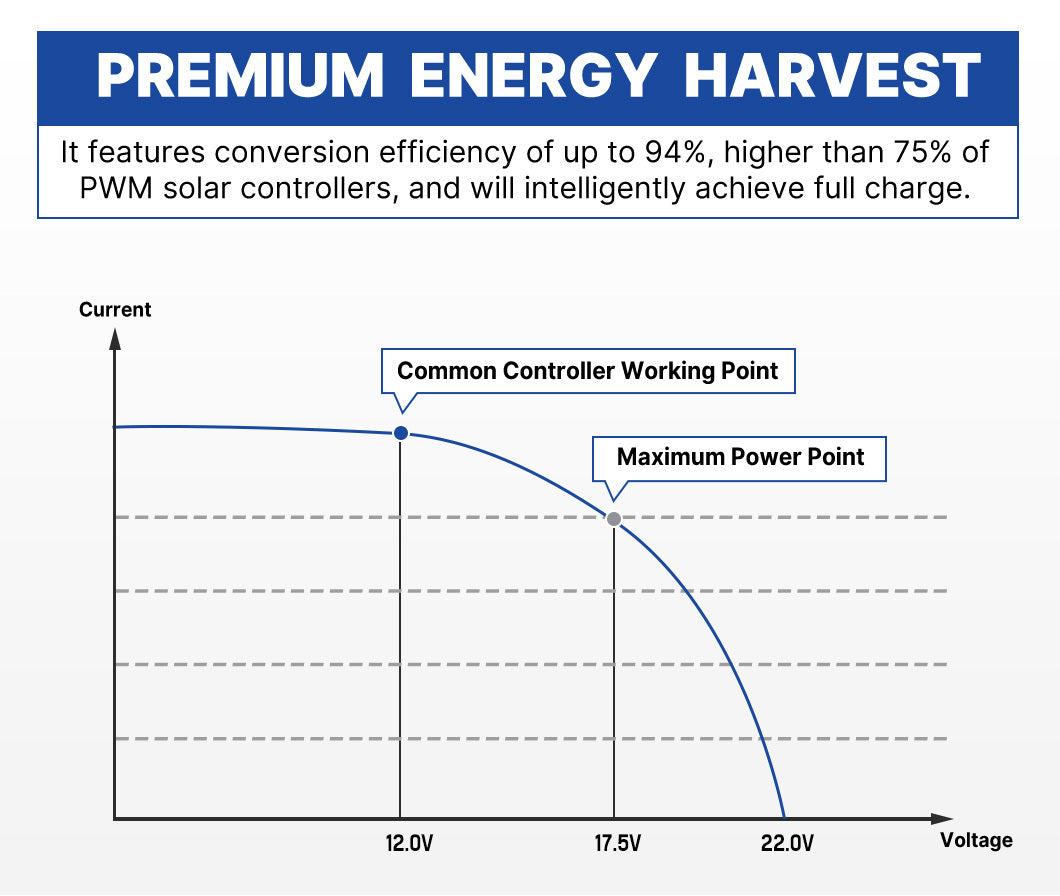 Premium Energy Harvest: It features conversion efficiency of up to 94% higher than 75% of PWM solar controllers and will intelligently achieve full charge.