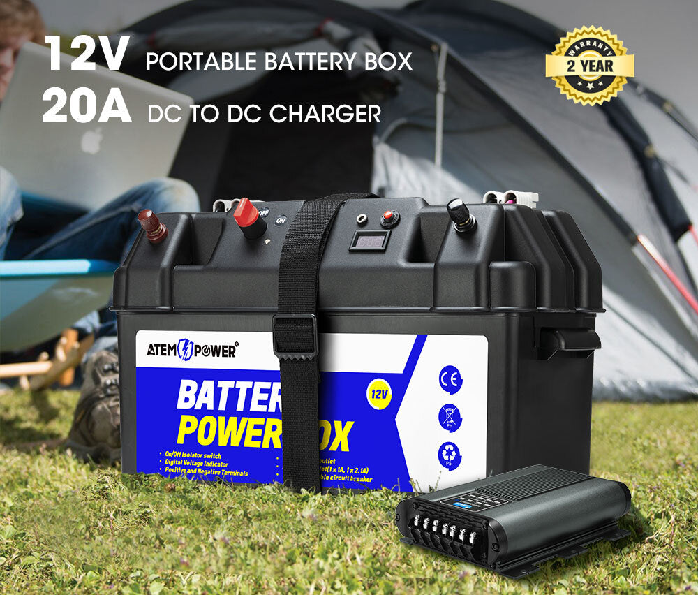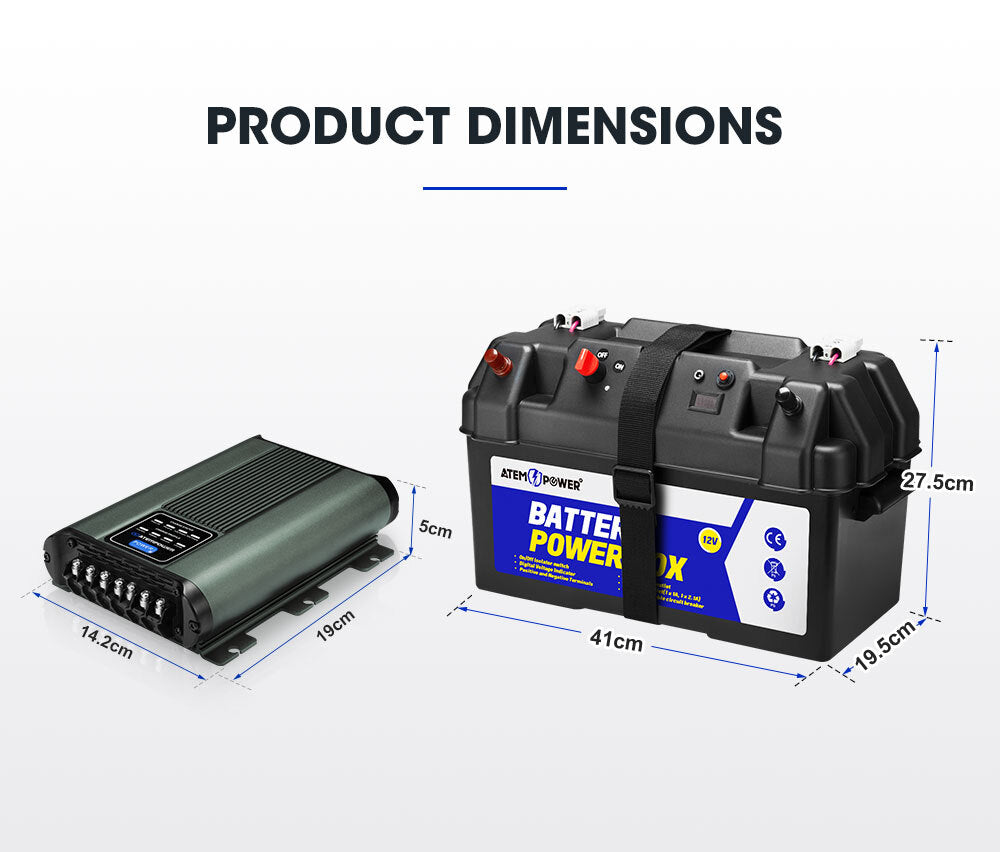 Gear up for your adventures with the ultimate dual-battery solution: the ATEM POWER 25A DC to DC charger. With its advanced features and superior performance this DC-DC charger is the perfect companion to keep your batteries fully charged and ready for action ensuring you never run out of power when you need it most. this DC to DC charger adapts seamlessly to the smart alternator inside your vehicle. Tap into the abundant solar power with its MPPT controller while effortlessly activating your sleeping LiFePO4 battery. Power limitations won't hold you back—conquer the outdoors with confidence! The expansive interior of our battery box easily accommodates most 12V batteries with dimension up to 35 x 18 x 20cm. With its prewired setup just connect our ATEM POWER marine battery box to your battery terminals for instant use.