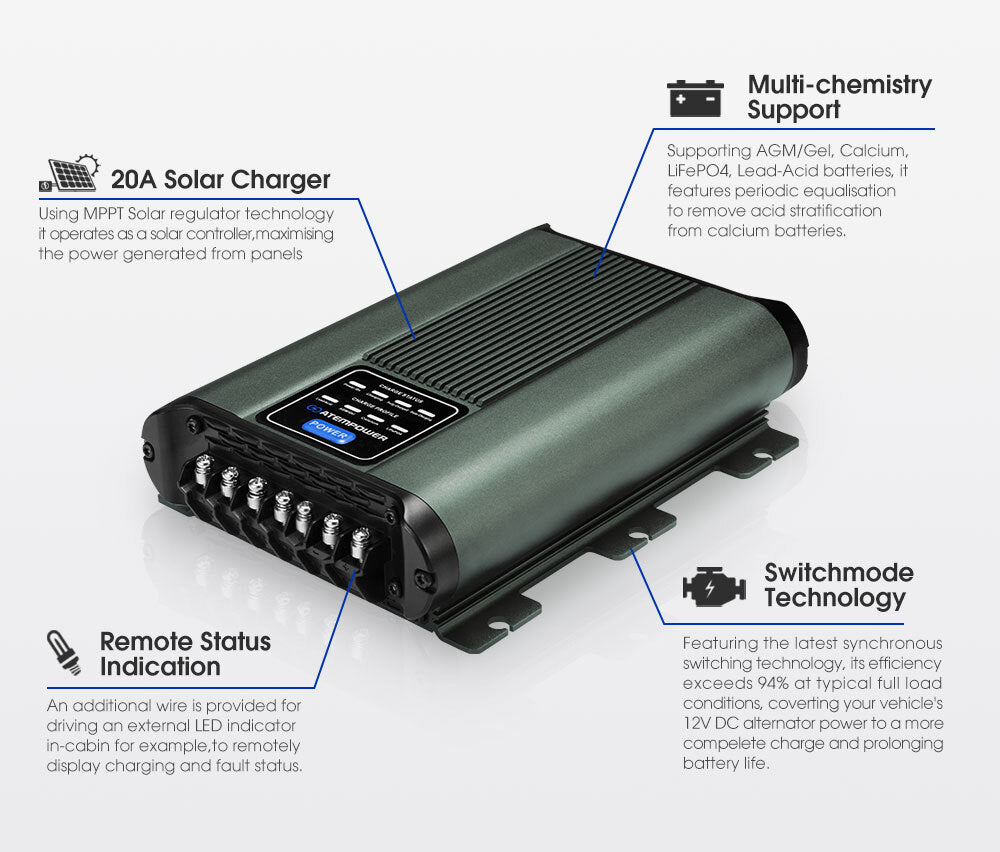 Charger-Boost Efficiency with MPPT: This DC to DC charger includes a MPPT controller increasing charging efficiency by up to 30% when connected to solar panels.