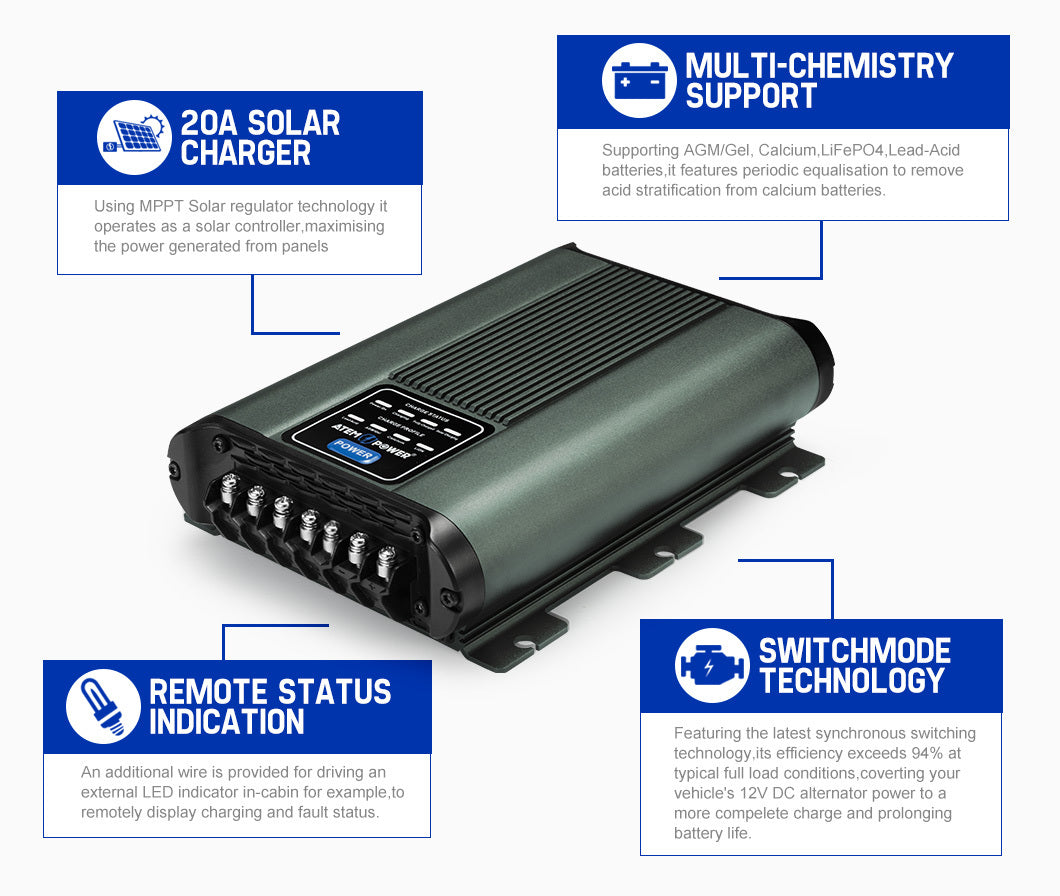 Boost Efficiency with MPPT: This DC to DC charger includes a MPPT controller increasing charging efficiency by up to 30% when connected to solar panels.