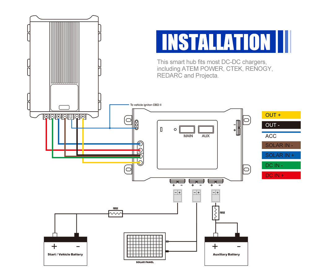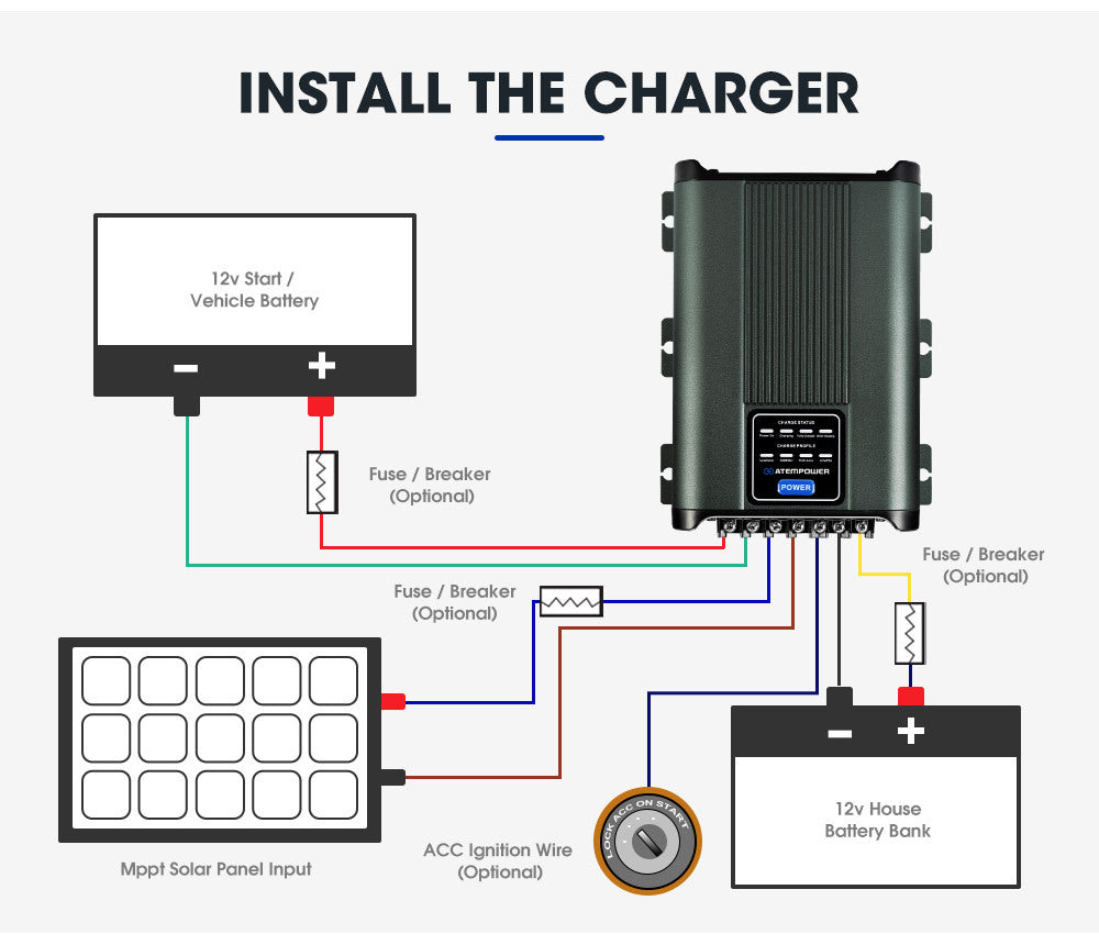 Gear up for your adventures with the ultimate dual-battery solution: the ATEM POWER 40A DC to DC charger. With its advanced features and superior performance this DC-DC charger is the perfect companion to keep your batteries fully charged and ready for action ensuring you never run out of power when you need it most. Unleash convenience with a DC to DC charger that goes both ways! From charging your flat starter battery to keeping auxiliary battery charged this charger has you covered. It's your perfect off-road companion—an upgraded automatic 3-stage charger. With up to 40A of power it charges AGM Gel Calcium Lead Acid and LiFePO4 batteries efficiently. And say goodbye to compatibility concerns as this DC to DC charger adapts seamlessly to the smart alternator inside your vehicle. Tap into the abundant solar power with its MPPT controller while effortlessly activating your sleeping LiFePO4 battery. Power limitations won't hold you back—conquer the outdoors with confidence!