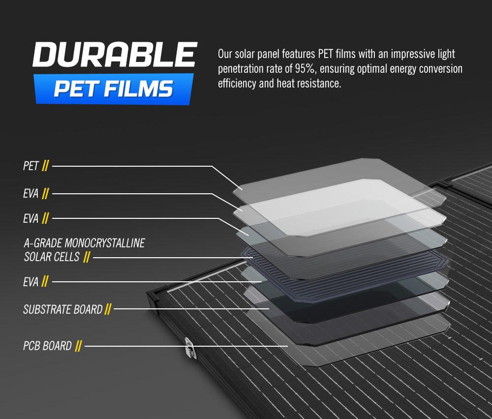 Durable PET Films: Our solar panel features PET films with an impressive light penetration rate of 95% ensuring optimal energy conversion efficiency and heat resistance.