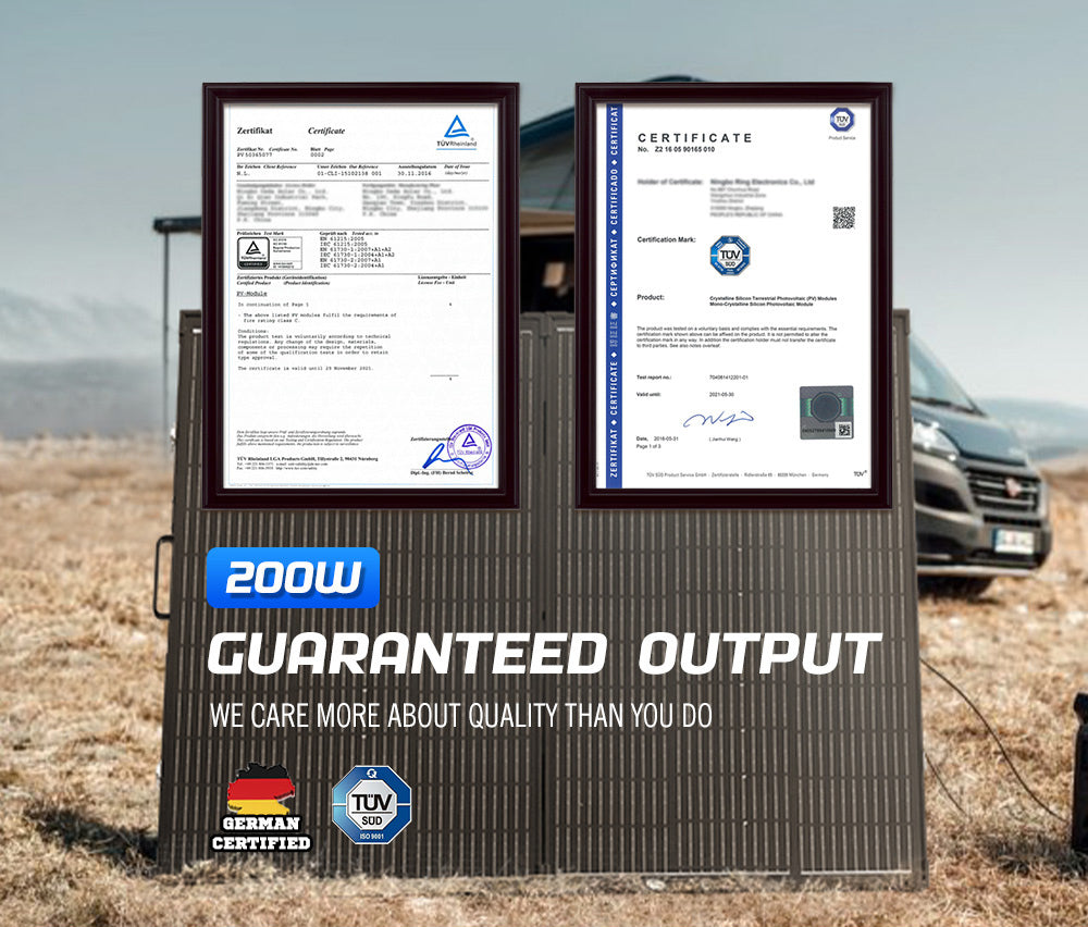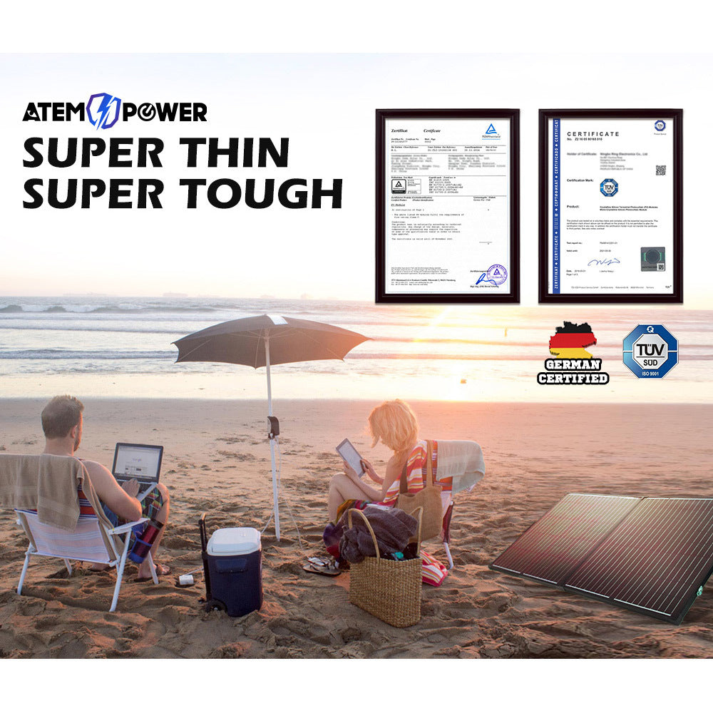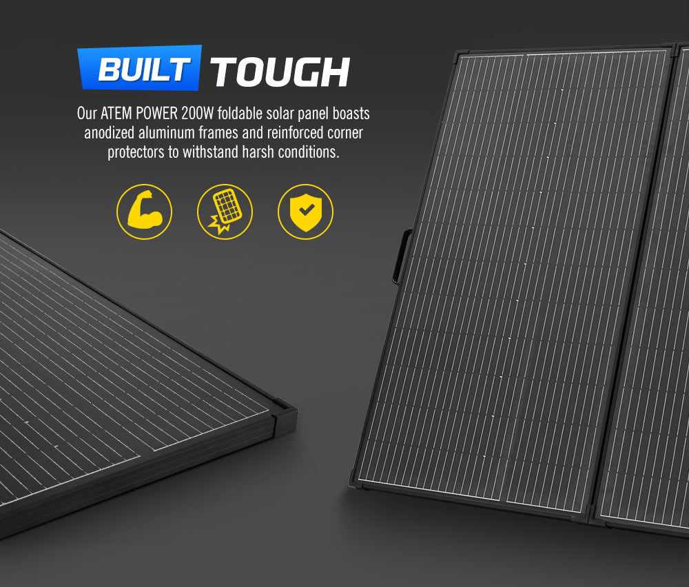 Built Tough: Our ATEM POWER 200W foldable solar panel boasts anodized aluminum frames and reinforced corner protectors to withstand harsh conditions.