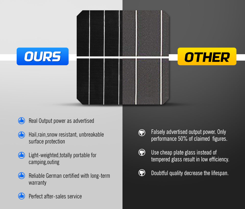 Power Up fast: Our A-Grade monocrystalline solar cells charge your devices at lightning-fast speeds with an energy conversion efficiency of up to 23.5%.