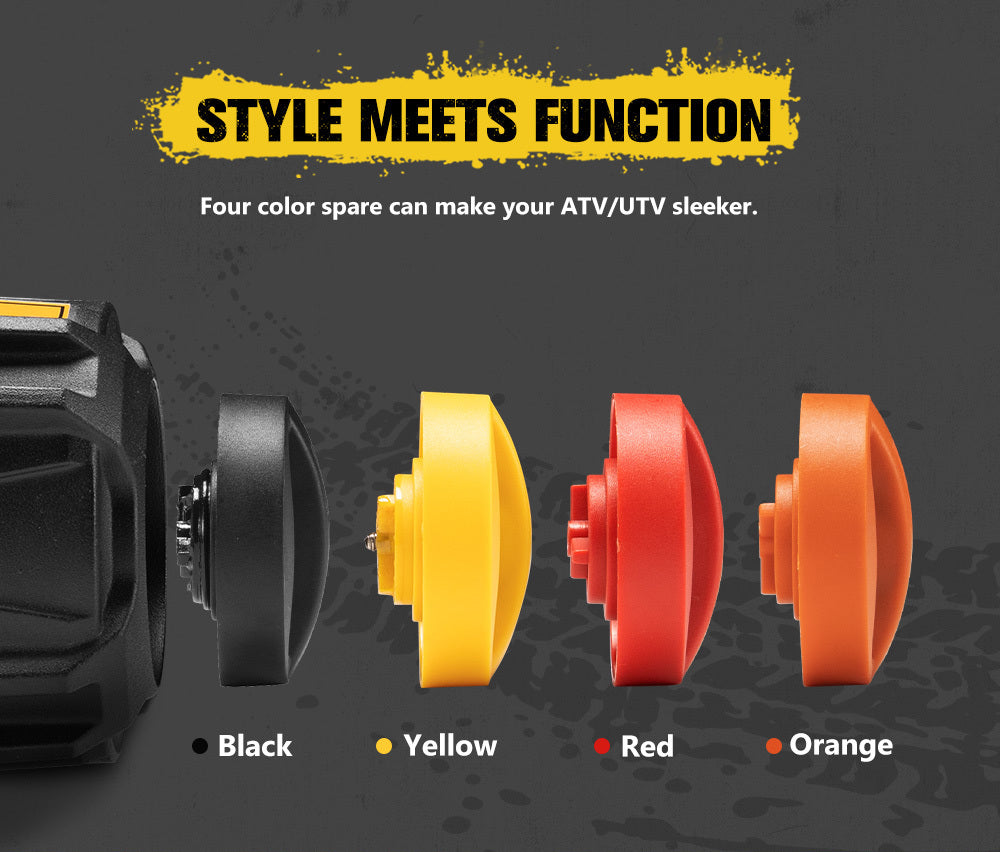 For those off-road enthusiasts who crave exploring the wilderness it's not a question of "if " but "when" you'll get stuck. That's where our BUNKER INDUST 6 000lbs electric winch can bail you out. When things get sticky whether for you or your buddies unleash its pulling power to save the day. Equipped with a 3.2HP permanent magnet motor it's connected to a 3-stage planetary gear system boasting a 192:1 gear ratio. This configuration ensures enhanced pulling power and faster line speed. Our ATV winch/electric winch features an aluminum housing with UV-resistant finish. Its IP67 rating defies harsh outdoor conditions. Installation is a breeze with its bolt-on design tailored for UTV/ATV. The automatic braking system will secure you on the steepest slopes. The remote controller also comes with integrated LED lights which can double as a work light. Moreover our clutch caps are available in yellow orange red and black enabling you to choose the color that fits your rig.
