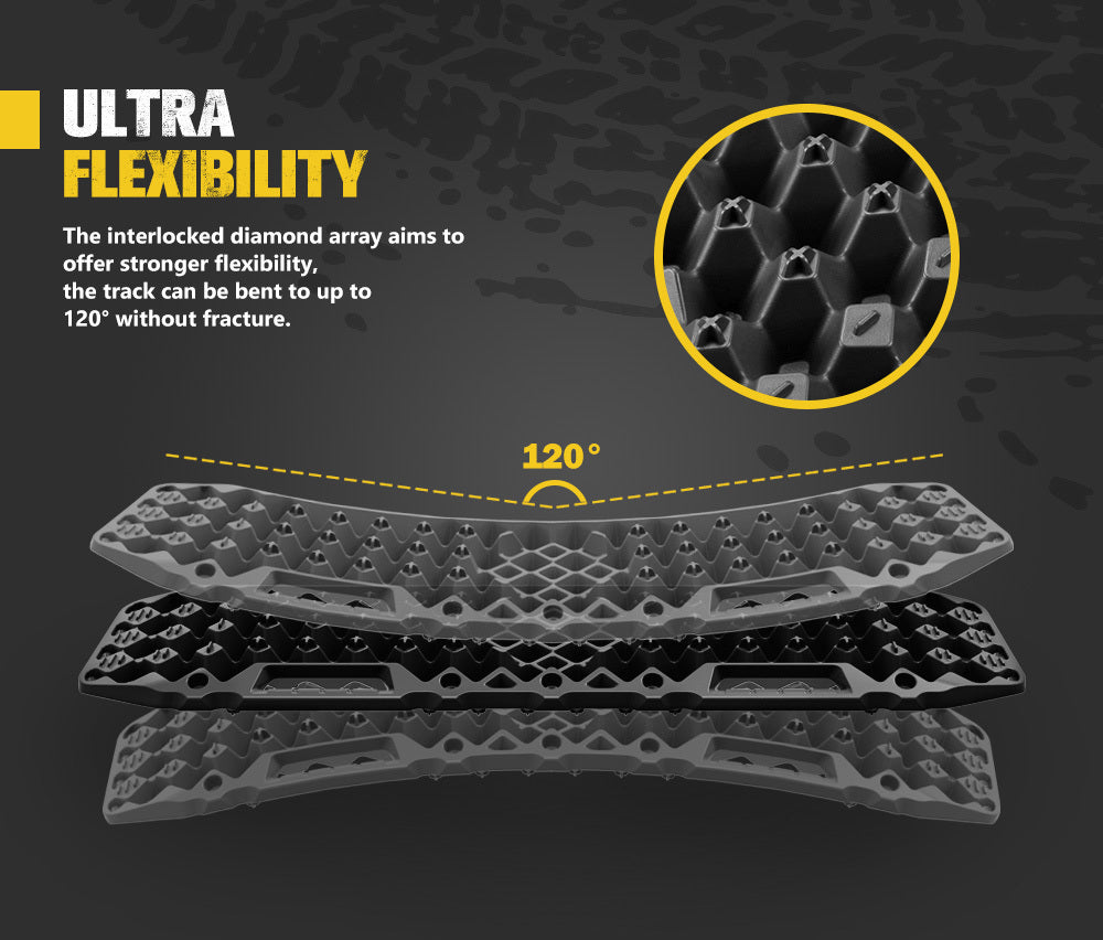Taking a 4x4 off-road presents the risk of getting stuck. When that happens few devices can match the efficacy of BUNKER INDUST recovery boards/recovery tracks. With a jack base aggressive teeth and wear-resistant properties the end goal of this offroad recovery track is to provide you with an unimpeded journey. Forget your old-fashioned recovery track this recovery board made from improved formula that offers excellent property in flexibility and resistance against UV aging and low temperature integrates an interlocked diamond array construction that makes a 120°bend without fracture a possibility! With 10 tons capacity it also has a jack base compatible with most farm jacks and ARB jack. The cross-shaped teeth are strengthened to avoid melting against drastic wheel spin and well positioned for added traction and bite. The offroad recovery track’s bottom not only inherits the same diamond array construction but also has the same function of the top for double capabilities.